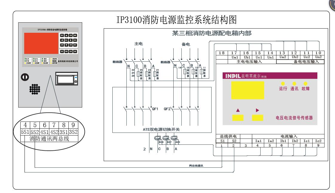 消防設備電源監控系統由消防設備電源狀態(tài)監控器(IP3100MA)、傳輸線(xiàn)纜和與其連接的電壓信號傳感器、電壓/電流信號傳感器等設備組成。系統連接如下圖所示: